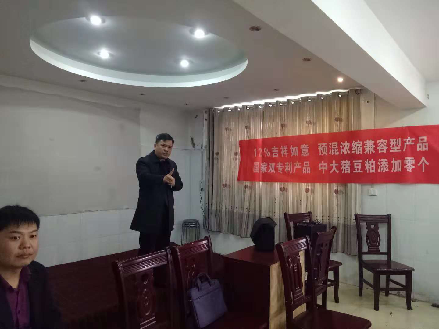 集会于10点30分在汪总的主持下正式开始,他首先介绍了参会嘉宾,并接待参会31名猪场老板齐聚水云间酒店,加入学习养猪知识;接着,营销中心南方卖力人程继亮先生介绍集会的重要性,并且详细介绍公司功效产品和配料本钱,特别是母猪料的功效性特点、仔浓的低豆粕配比优势,获得参会猪场的认可。专利产品的推广可获国家补贴、贷款的支持、非洲猪瘟包管的优先治理等一系列优惠政策,获得猪场朋友的热烈接待。